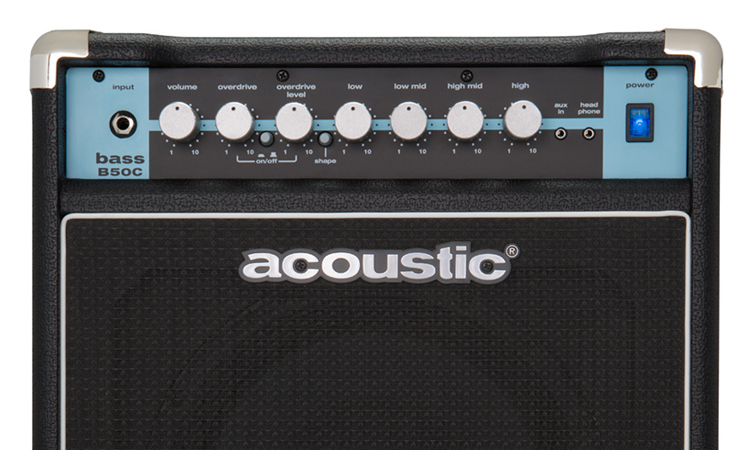 The Acoustic B50C C-Series 50-Watt Bass Combo Amp is ideal for practice, rehearsal and small-venue performance. Its custom-voiced 10” ferrite speaker provides classic Acoustic tone while its tilt-back style cabinet allows for precise personal monitoring, useful when on small stages where space is at a premium.