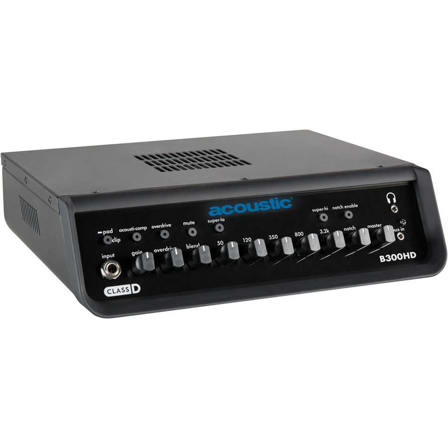Ideal for rehearsal, practice and most club stages, the Acoustic® B300HD bass head is your entry to world-class tone and portability. With a 300-watt Class-D power section housed in a sleek, ergonomic chassis, it’ll fit anywhere were space is at a premium*. Our legendary tone shaping controls include a 5-band rotary EQ, defeat-able notch filter, and super Hi & Lo EQ boost, providing a wide array of sonic possibilities. A full-featured direct output gets you easily connected your recording rig, and the Acousti-CompTM compression keeps your dynamic range smooth and in check. The B300HD bass head is a powerful start to capturing your own “Pro’s Tone” from Acoustic®.